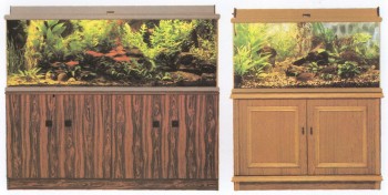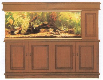Тумба и шкаф с витриной так и называются: аквариумная мебель или шкаф-аквариум. Рынок специализированной торговли теперь имеет в ассортименте и эти изделия на любой вкус. В больших помещениях аквариумы часто выполняют роль ширмы, разделяя пространство. Для такой цели очень подходят шкафы, которые можно обозревать с трех сторон, В задней, обращенной к стене части у них находится ящик с отводами к техническим аппаратам, расположенным в нижней тумбе.