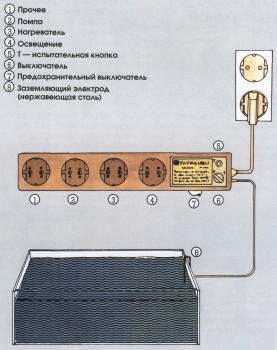 Техника безопасности при обращении с электричеством вблизи воды (например, при поломке стеклянного нагревателя). Фирма «Tunze» предлагает защитное устройство: планку со штепсельными розетками, встроенным FI-выключателем и заземляющим электродом.