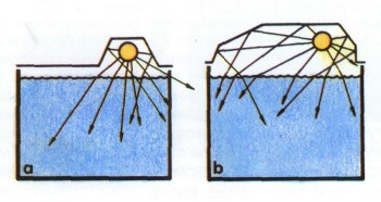 Распределение света закрытыми верхними лампами обеспечивают размеры ламп и качество отражения. При слишком маленькой отражающей поверхности (а) освещается только расположенная непосредственно под ней часть аквариума. Хороший рефлектор должен освещать все уголки аквариума (Ь).