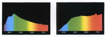 Как видите, один дневной свет и другой дневной свет —разные вещи. Если цветовая температура света поднимается до 10000 К, то преобладает содержание синего (слегка голубоватого белого цвета); если цветовая температура понижается (слегка желтоватый белый) за счет прямой инсоляции, то максимум интенсивности света переходит в область от желтого до красного. Видимый свет находится в диапазоне между 380 и 780 нм длины волны (нм или nm — нанометр, одна миллиардная доля метра), от фиолетового до темно-красного.