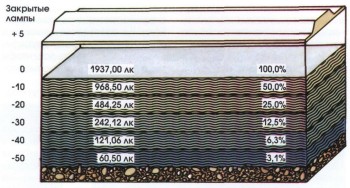 При освещении аквариума внутри следует обратить внимание на две вещи. Между лампой и дном аквариума есть различные помехи: свету нужно их преодолеть, то есть соответственно через них проникнуть. Это, в первую очередь, покровное стекло, которое следует рассматривать не только как стеклянный барьер, но чаще всего (особенно при загрязнении) и как световой фильтр. Во-вторых, это водное зеркало, не случайно получившее свое название: поверхность воды частично отражает падающий свет. И, наконец, сама вода: при увеличении глубины на каждые 10 см в воде «средней прозрачности» происходит потеря примерно 50 процентов излучения. Таким образом, если на поверхности воды зафиксированы 2000 люксов, то в резервуар на глубину 65 см попадают только 60 люксов (при 10-сантиметровой толщине грунта и 5 см свободного пространства над зеркалом воды). Цвет освещения, вероятно, важен не столь для рыб, сколь для растений. В естественной жизненной среде рыб и растений происходит так, что освещение в течение дня и вместе с перемещением солнца изменяет свои спектральные цвета. Если небо покрыто облаками, то свет окрашен синевой и температура цвета поднимается до отметки 10000 К (° Кельвина), в то время как под знаменитым синим небом и при прямом попадании солнечного света она от нейтральной точки (= 5600 К) опускается до 4300 К. Желтовато-белый источник света, известный нам как обычная лампа накаливания, приводит температуру к отметке 2860 К. Для фотографии нейтральная точка установлена как 5600 К (дневной свет). Так называемая норма света для производителей трубчатых ламп составляет 5000 К. Как же поступить с этими сведениями аквариумисту?