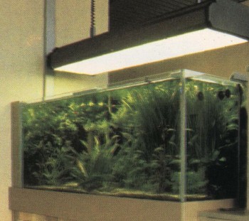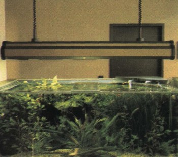 На иллюстрации — подвесной осветительный прибор типа Duplasun с несколькими трубками. Рост и кустистость растений в аквариуме доказывают интенсивность освещения такого типа.