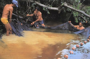 Воды Риу-Негру несут с собой также и взвешенные частицы, привнесенные Риу-Бранку (Белой рекой) и отложившиеся (вернее, откладывающиеся и до сих пор) в районе архипелага Анавильханас выше города Манауса. Когда вода взбаламучена (как на фотографии, где вытаскивают рыбу), осадок поднимается вверх и вода приобретает цвет кофе с молоком.