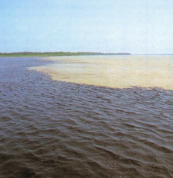 "Черная" река Риу-Негру, левый приток Амазонки, окрашивает ее воды в молочно-желтый цвет.