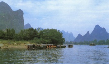 Вид на реку в карствой области близ города Гуйлинь в Южном Китае. На берегу рыбаки сушат сети. В уединенных бухтах можно обнаружить рыб, интересных с точки зрения аквауримистики.