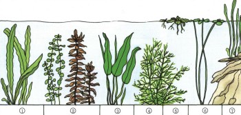 Типы водяных растений: 1)растения с лентовидными или нитевидными, 2)с грубыми или мохоподными, 3)с черешковыми, 4)с тонкоперистыми листьями, 5)плавающие на поверхности и в толще воды, 6)растения с плавающими листьями, 7)болотные растения.