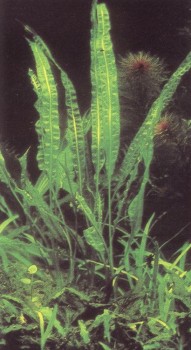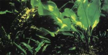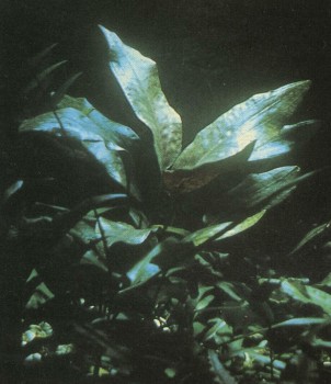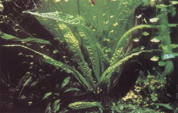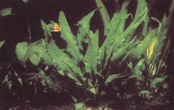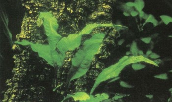 Это растение не только декоративно, но и интересно: его нельзя просто посадить, как другие, а можно только «присадить» с помощью резинового колечка. Его ланцетовидные листья сидят на очень коротких стеблях, пускающих в свою очередь ползучие корни, Отходящие от этих ползучих корней якорные корни нужно очень осторожно, чтобы не поранить, разместить на субстрате (камень или, еще лучше, расщепленная коряга) и оказать им «первую помощь» в укоренении тонким шнуром или резинкой. Листья этого растения в природных условиях достигают максимальной длины 40 см, но в аквариуме вырастают лишь наполовину.
