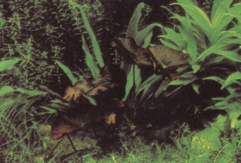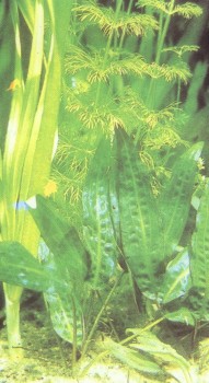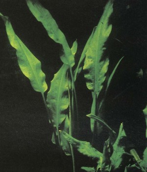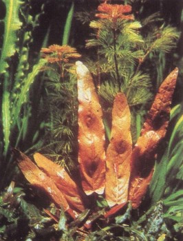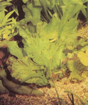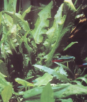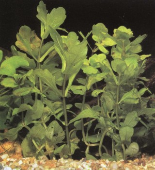 Это растение отличают волнистые буро-зеленые листья; в аквариуме оно достигает высоты 20 — 25 см. Отдельно посаженные экземпляры смотрятся не так эффектно, как аранжировка. К условиям аквариума они приспосабливаются хорошо, и рыбы общипывают их редко. Этот вид тоже легко размножается. Отросткам можно предоставить возможность дальнейшего развития, но можно и отсадить сформировавшиеся побеги. Даже если их корни окажутся на поверхности, они будут развиваться дальше.