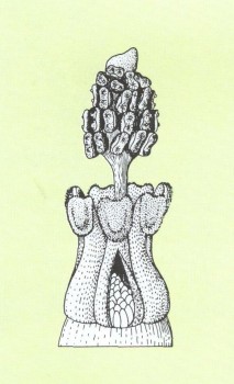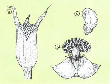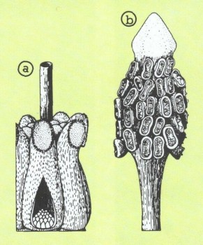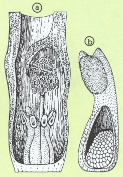 Cryptocoryne wendtii: а) Несколько завязей, одна из них раскрыта, b) конец стебля с тычинками.