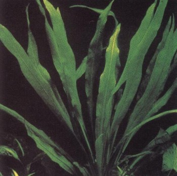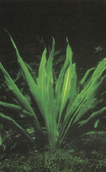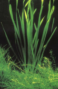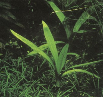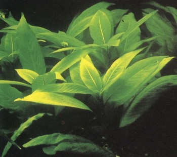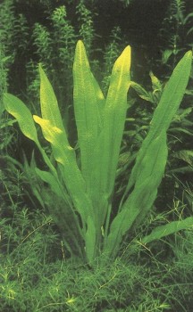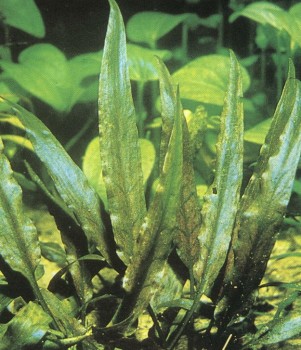 Частый гость аквариумов отличается яркой зеленой окраской. Листья достигают до 40 см в длину, и если им не мешает верхнее стекло, нередко вырастают выше поверхности воды. Требует много света; в богатой питательными веществами почве быстрее пускает побеги. Благодаря своим широким светло-зеленым листьям прекрасно выглядит и как солитер; тем самым уже сказано, что этот вид отличается довольно крупными размерами, а потому подходит скорее для большого, чем для маленького аквариума. Соответственно привычным ему природным условиям — тяжелой почве и солоноватой воде вблизи от морского берега — это растение может хорошо развиваться в аквариуме с довольно жесткой водой при несколько повышенном показателе рН. Температура — около 25° С. Размножается отростками, но дает их обычно только при оптимальном уходе.