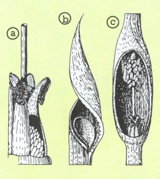 Cryptocoryne undulata: а) завязи, одна из которых раскрыта (надводное содержание), b) вход в цветок, с) открытая камера с завязями (внизу) и тычинками (вверху).
