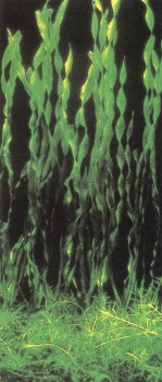 Этот гигант, представляющий род валлиснерий, делает честь всем своим собратьям, когда живет в тропическом аквариуме: он развивает лентовидные листья шириной примерно 4 см, а длиной до 2 м! Даже в больших резервуарах это растение чаще всего бывает вынуждено расправлять листья на поверхности воды, потому что уровень ее всегда оказывается для него недостаточно высоким, а в толще воды ему не хватает места. При всем том гигантская валлиснерия — настоящее водное растение! Часто его размещают в больших аквариумах, где живут цихлиды: некоторые виды этих рыб обгрызают растения, поэтому в таких случаях желательны жесткие стебли и листья. Верхний край листа этой валлиснерии отличают мелкие зубчики. Отдельные растения принято сажать группами, потому что только так они раскрываются во всей красоте. Температура воды не должна опускаться ниже 18° С, а грунт должен быть плотный. Цветки плавают на поверхности воды, держась на стеблях, порою и очень длинных. В домашнем аквариуме едва ли можно рассчитывать на размножение путем опыления цветка. Чаще всего гигантская валлиснерия размножается отростками, но вода при этом не должна быть слишком мягкой.