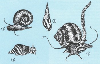 Четыре вида улиток, наиболее часто встречающиеся в наших аквариумах: 1) красная роговая катушка; 2) мелания песчаная; 3) ампулярия (с вытянутым "хоботом"); 4) тот же прудовик обыкновенный, растительноядная улитка, которую чаще всего заносят в аквариум вместе с живым кормом.
