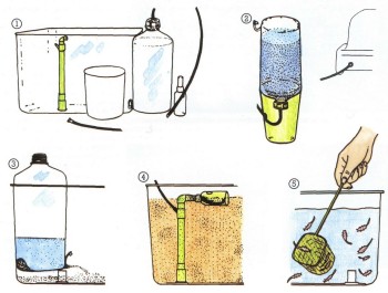 На этом рисунке изображены методы разведения и выращивания артемии с помощью «Hobby-Artemium» (фирма «Dohse») — инкубатора и сепаратора: 1) набор приспособлений «Artemium»; 2) получение личинок из икры; 3) промывка личинок в выростном резервуаре; 4) добавка специального корма «Mikrozell» 5) отлов подросших рачков для выкармливания.