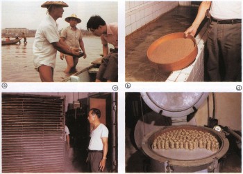 Производство сублимированного корма на Тайване: a) Промытый живой корм оценивается специалистами. b) После производственной очистки живой корм готов к дальнейшей обработке. c) Корм быстро замораживается и дегидрируется. d) После взвешивания его размещают в вакуумной упаковке.