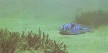Cyrtocara moorii. Типичное для этой рыбы жизненное пространство: песчаное дно, кое-где поросшее валлиснериями. Подводная съемка.