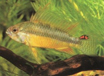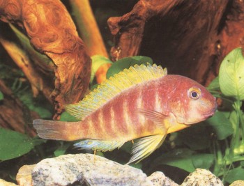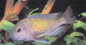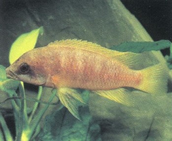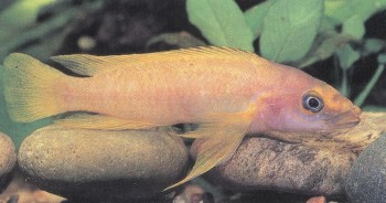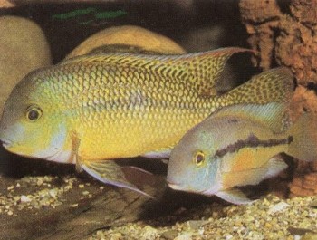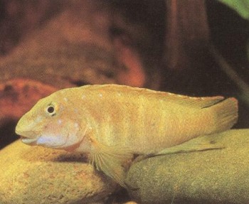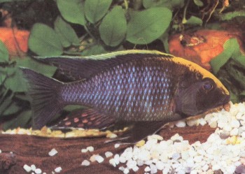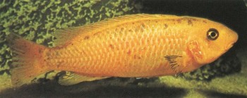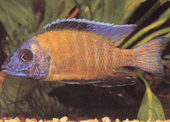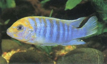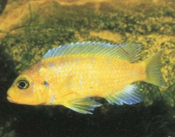 Pseudotropheus lombardoi, желтый самец (а его партнерша отличается синей окраской с темными полосами)