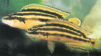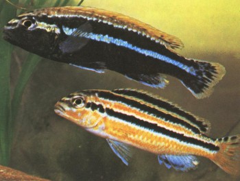 Melanochromis auratus. Самец темной и самка желтой окраски.