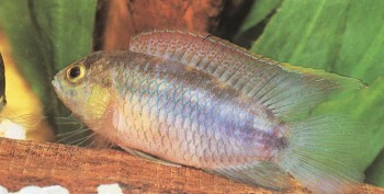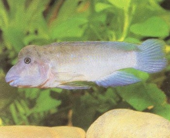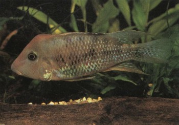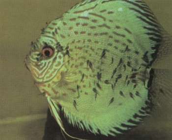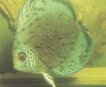 Цветовая форма «бледная бирюза». Покровы этой рыбы содержат питательный секрет для мальков, и это снижает интенсивность расцветки (самка)