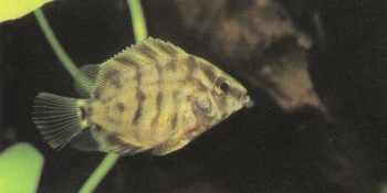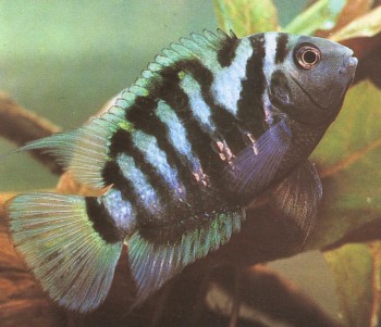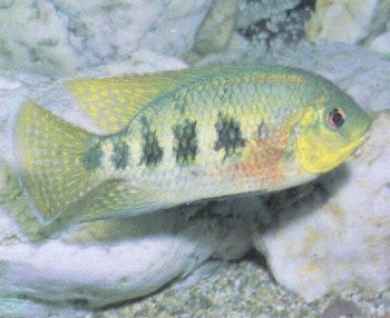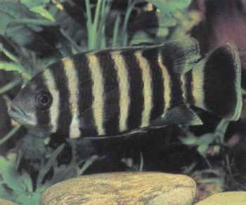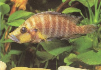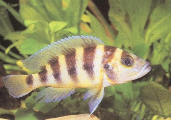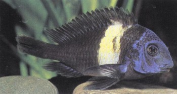 Tropheus duboisi. Вариация с широкой поперечной полосой желтого цвета.