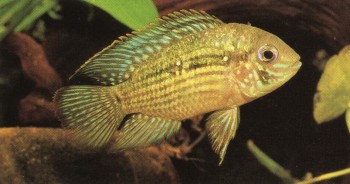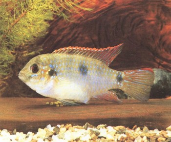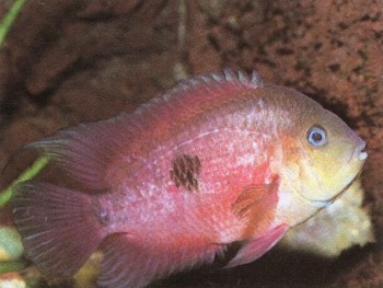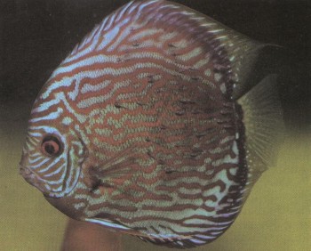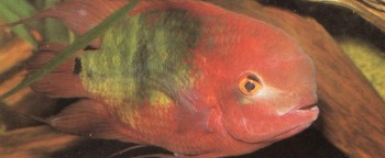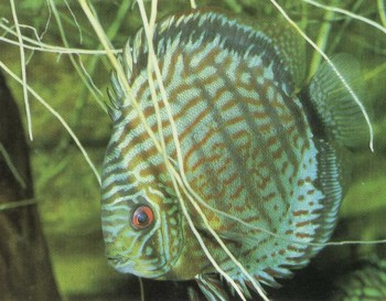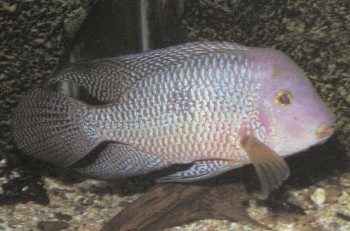 Цветовая форма «бледная бирюза». Покровы этой рыбы содержат питательный секрет для мальков, и это снижает интенсивность расцветки (самец)